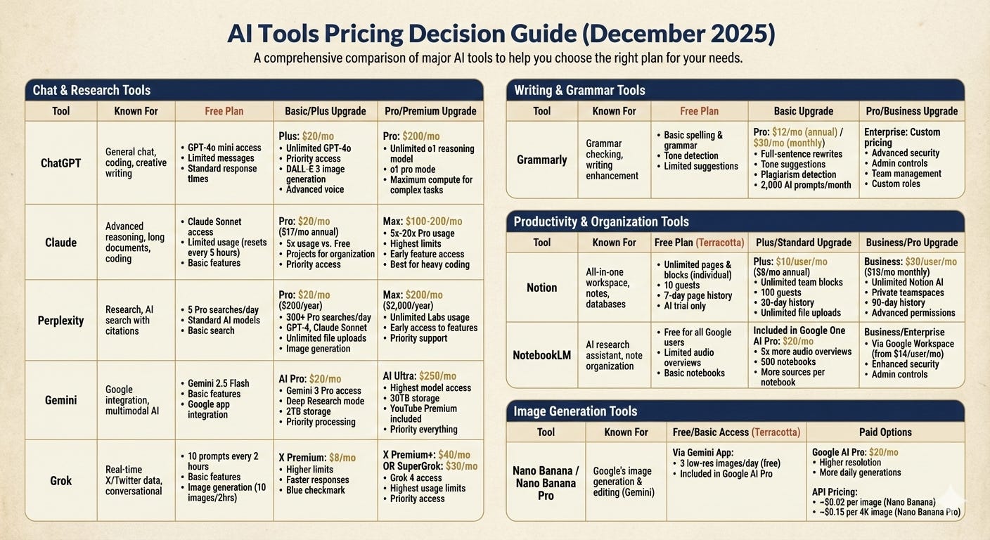 Nano Banana created this chart for me based on research for AI Tools Pricing. I’ll be honest, it’s a nice chart for today, but it will be obsolete in months as new tools come into the market. The key takeaway is that they cost money and ideally you pick one or two to really test out before you commit. I have tried all of the tools below.